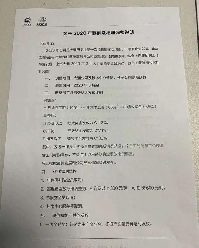 因此,文件中称,上汽大通人力资源委员会根据薪酬福利与公司经营绩效挂钩的原则,结合上汽集团的工作布置安排,从2020年3月起调整大通公司及技术中心全员的月绩效奖金发放比例,取消年休假补贴和书报券、技术中心服装费,调整高温费发放标准等。