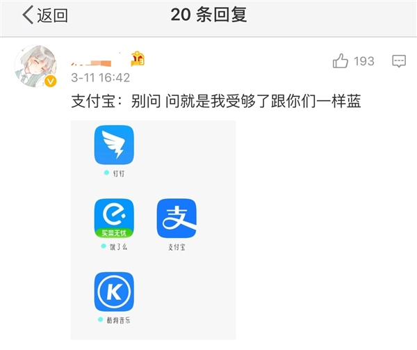 但是网友们并没有就此放过支付宝,继续各种脑洞大开调侃之。支付宝官方公众号也是一如既往的皮,把大家的“创意”集中呈现了出来,尤其是把它和最近多灾多难、LOGO同样蓝色的钉钉给联系在了一起,一个比一个蓝。