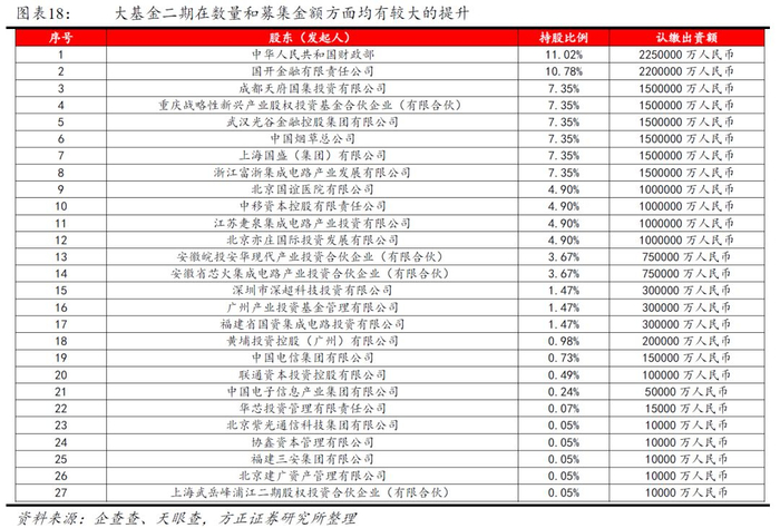 2019年10月22日国家集成电路产业投资基金二期股份有限公司正式注册成立,注册资本2041.5亿元人民币。相对于大基金一期而言,大基金二期在募集股东数量和募集金额方面均有较大的提升,资金来源有国家机关部门、国家级资金、地方政府背景资金、央企资金、民企资金及其他投资资金等。