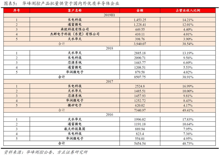 公司品牌形象与日俱增使得相关产品也得到了下游知名客户的认可。①目前,公司客户涵盖了集成电路设计、晶圆制造和封装测试三个环节。主要产品已在长电科技、通富微电、华天科技、华润微电子、华为、意法半导体、日月光集团、三垦等国内外知名半导体产商实现了批量销售。②从历年销量数据看,2016-2018年公司半导体自动化测试系统销量分别达到了212、273和403套,呈现良好的发展势头,2019上半年半导体行业景度较2018年有所减弱,公司依然实现IC测试系统销售208套。迄今为止,公司旗下产品AccoTEST模拟IC测试机的销售已超过2300台,华峰测控已经是国内最大的半导体测试机本土供应商,更是为数不多进入国际封测市场供应商体系的中国半导体设备厂商。