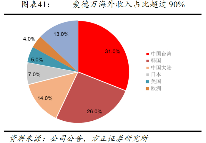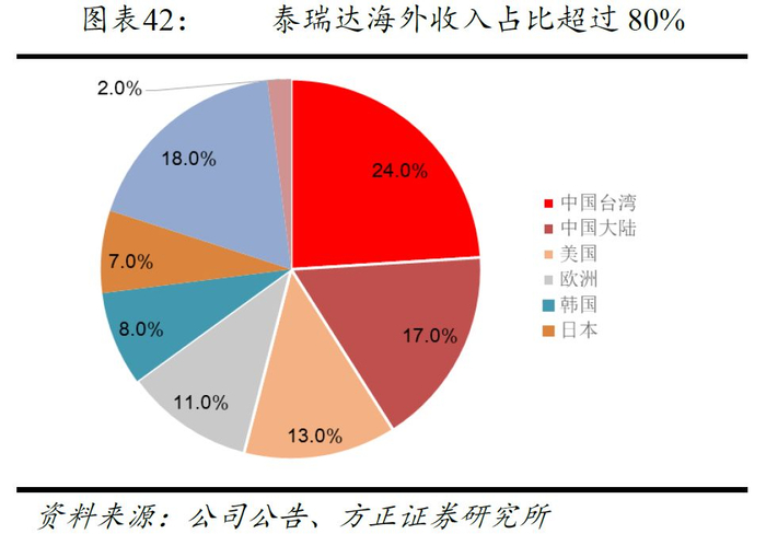 全球半导体产业的地域分布特征导致了国际ATE设备龙头海外收入占比较高。①2018年爱德万按地区收入构成中:中国台湾、韩国和中国大陆收入占比分别为31%、26%和14%,反观日本本土收入占比仅为7%,爱德万超过93%收入来自海外。②我们在泰瑞达同样发现了这一现象,2018年泰瑞达美国本土收入占比为13%,中国台湾、中国大陆收入占比较高,分别为24%和17%,海外收入合计占比达到87%。