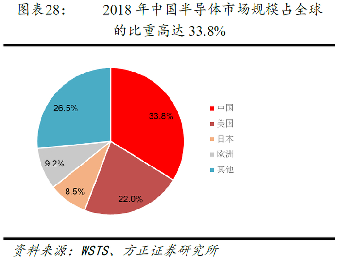 本土集成电路产业持续快速增长,我国已经成为全球最大的集成电路市场。①2018年中国集成电路产业在世界经济温和增长中经受贸易单边主义冲击的情况下,仍取得了可喜的成绩。据CSIA公布数据,2018年中国集成电路产业销售收入达6532亿元,同比增长20.7%,高于全球整体增速,随着产业结构的调整,中国集成电路的需求将持续增长。②从全球半导体市场规模看,2018年全球半导体市场规模约4688亿美元,中国地区占比高达33.8%,中国已经成为全球最大的集成电路市场。