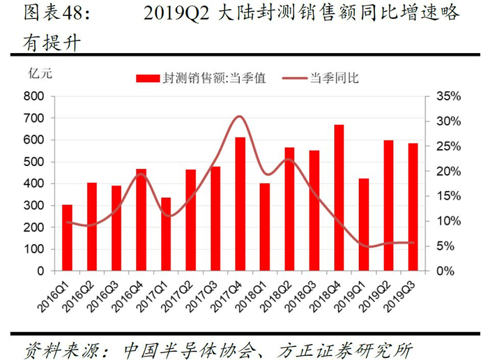 代工厂产能利用率的持续提升直接推动封测企业产能利用率逐月回升,封测行业复苏迹象明显,无论是大陆封测行业销售额还是台湾封测销售额,二季度开始出现了回升态势。