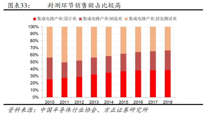 在集成电路三个环节中,封测发展较为成熟,在我国集成电路产业中占比较高。2010年封测销售额占比高达43.79%,近些年随着本土IC设计企业的快速崛起,封测占比有所下降,但2018年集成电路封测业销售收入为2193.9亿元,占到全年总值的比例依然高达33.6%,仅次于IC设计,仍然高于晶圆制造。