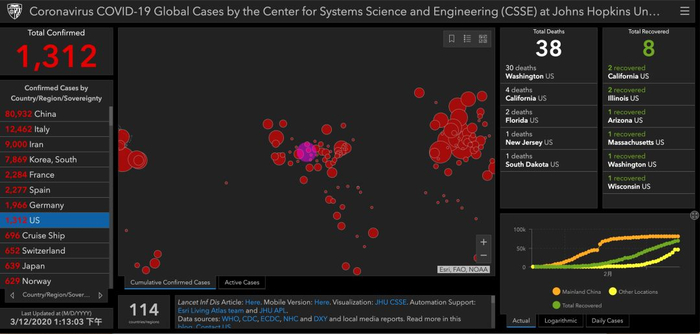 在全美范围内,患病人数不断扩大。根据约翰·霍普金斯大学的实时追踪数据,截至北京时间3月12日中午12点,美国确诊人数超过1300例。高发地区仍集中在华盛顿州、纽约州,以及加州。