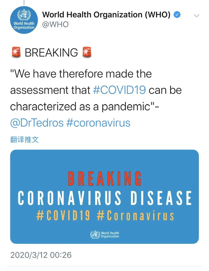 特朗普发表电视讲话之前,世界卫生组织(WHO)总干事谭德塞(Tedros Adhanom Ghebreyesus)在日内瓦总部的记者会上宣布,WHO经过疫情评估后认为,新冠肺炎已构成“全球性流行病”(pandemic)。这引发了美国市场行情的迅速下滑。