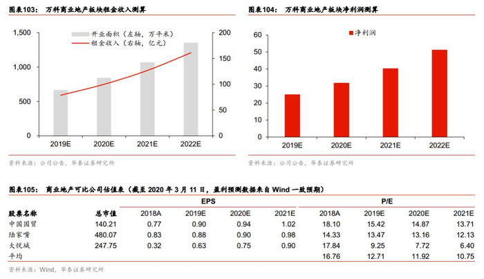 截至2019年上半年,万科商业地产目前在管规模为1350万方,其中2019年年中已开业面积为643万方,主要布局于全国一二线城市,我们认为从城市业态分布来看,万科商业的运营规模可对标华润、大悦城以及龙湖集团的商业地产板块。我们以华润、大悦城、龙湖集团的商业体运营情况来测算万科商业地产的估值。根据三家对标企业的年报可测算得出,2018年三家房企的平均坪效(租金口径)为1192万方,以此类推,我们预计万科19年全年的开业面积约660万方,假设目前在管规模项目将在未来三年内全部开业,预计19-21年的租金分别为79、100和127亿元。