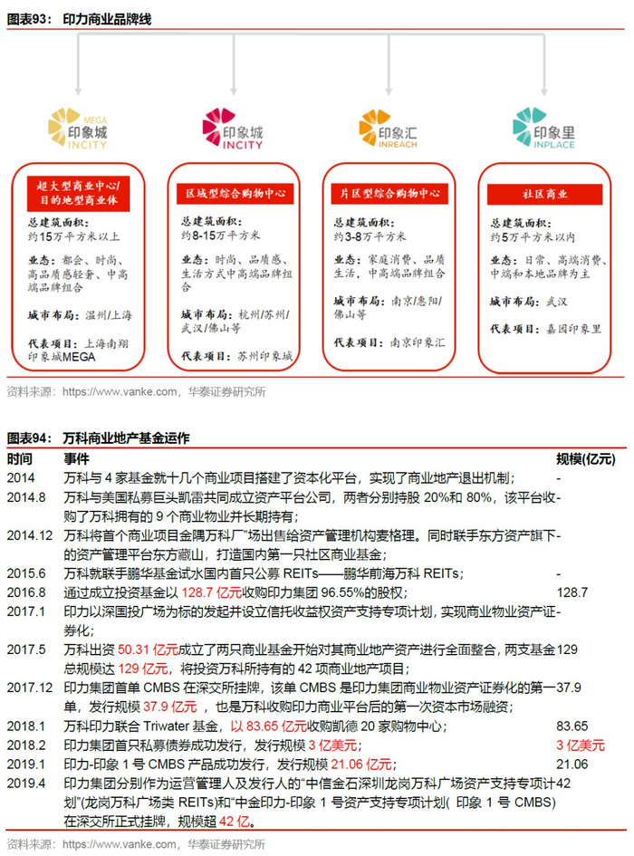 集团以印力集团作为商业开发与运营平台。印力是万科于2016年通过成立投资基金,以128.7亿元所收购的商业地产运营品牌,目前万科通过直接或间接持有印力集团62.07%股权。截止2019上半年,印力集团已经运营了16年。集团管理商业项目共计210余个,总建筑面积超过1300万平,已开业项目达643万方,其中90%为购物中心。管理的项目已形成印象城、印象汇、印象里等产品线,购物中心的整体出租率(不含改造项目)约97%。在观点指数研究院发布的“2019中国商业地产运营能力排名”中位列第四。