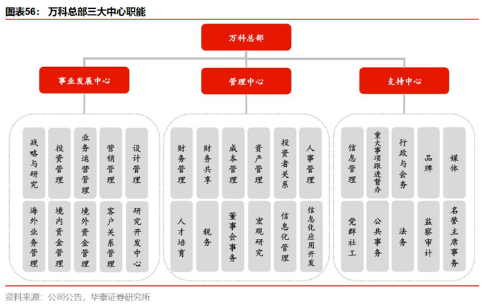 这主要体现为万科总部架构的调整——18年原有的12个职能部门全部被撤销,设置三大中心:事业发展中心、管理中心、支持中心,三大中心对应前中后台业务。其中事业发展中心的职能包括战略、投资、运营、营销、设计、资金、客户关系、研发等;管理中心职能包括财务管理、投资者关系、人事管理等;支持中心职能包括信息管理、行政与会务等。取消部门分管领导和部门经理,除集团合伙人外三大中心由26个中心合伙人进行管理。予以更多人获得复合增长机会,组织也更加扁平化。