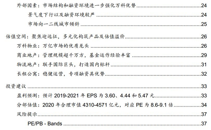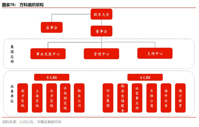 4估值空间:聚焦迎远征,多元化构筑产品及估值溢价关于万科未来的第二个问题是估值空间。万科自2014年便提出“八爪鱼”战略,开启地产相关产业链的延展。2018年万科进一步将业务单位划分为5个BG(事业群)及6个BU(业务单元),BG包括南方、上海、北方、中西部区域及物业服务公司,BU包括商业地产、物流、长租公寓、冰雪、海外业务以及教育,经过清理非核心资产,6个BU即万科执行5年的“八爪鱼”战略后成功孵化的多元化方向。万科内部也对四大区域公司区分了业务发展侧重点,除了传统开发业务外,北方区域涉足产办、泊寓,上海区域涉足商业、产办、泊寓,南方区域主要是商业、产办。