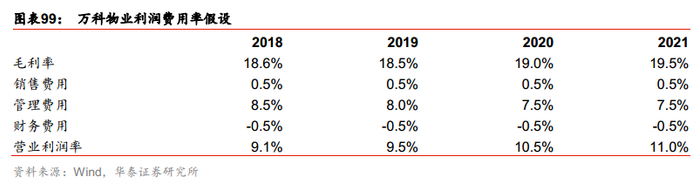 毛利率方面,万科物业15-17年的毛利率区间为18%-23%,18年为18.6%,由于新增项目物业费重新定价能够改善毛利率,但另一方面公司在快速扩张阶段会牺牲部分盈利空间,综合预计19、20、21年毛利率分别18.5%、19%、19.5%,参照碧桂园服务、保利物业、绿城服务、新大正四家公司18年三费占比,销售、管理、财务费用占收入比重均值分别为0.7%、10.7%和-0.4%,管理费用占比最高,其中碧桂园服务的管理费用率高达16.2%,其余三家均值为8.8%。如我们前文所述,万科的管控能力数业内一流,因此我们认为物业板块18年三费率控制在8.5%,且随着规模扩张还有逐年进一步下降的空间。我们预计19-21年的三费率分别为8%、7.5%和7.5%。