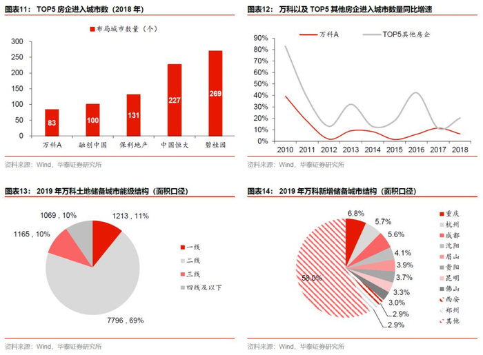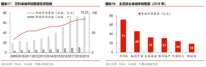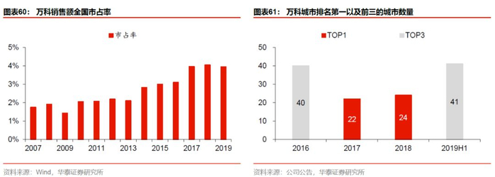 公司的渗透能力已被市场持续证实。目前万科在全国的市场占有率为4%,根据公司最新新披露数据,截至2018年,在公司已布局的80余个城市中,市场销售排名第一的城市数达24个,据2019年中报披露,排名前三的城市数达41个。
