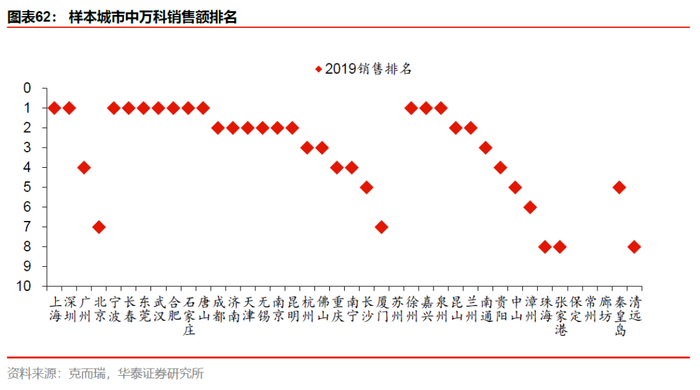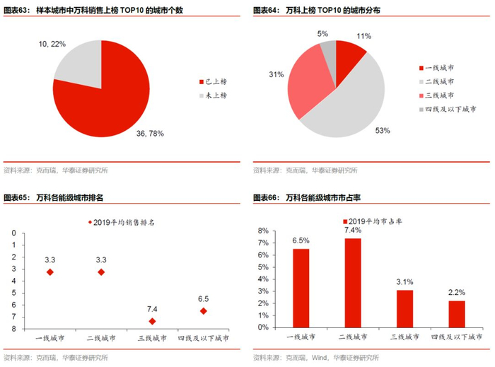我们采集了克而瑞60个城市销售榜单的数据,其中万科已进入城市达46个,而2019年万科排名位于TOP10的城市数为36个,万科上榜城市中,一、二、三和四线及以下的城市数分布分别为10%、50%、35%和5%。