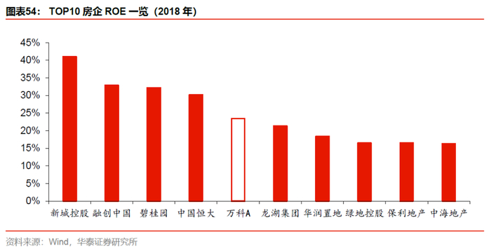 随着万科立体管理机制的推进,公司ROE近年在20%基础上持续提升,18年ROE达到23.4%,较A股龙头房企均值高4.7个百分点,仅低于新城控股和华夏幸福。在规模TOP10房企中,万科的ROE处于中位,除新城控股外,低于杠杆水平更高的融创、碧桂园以及恒大。