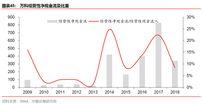 万科具备优异的现金流管控能力。在报表上最直观的体现,即万科是09年至今A股唯一一家经营性净现金流持续为正的龙头房企(此外内房股中也仅有龙湖集团满足这一条件)。尤其是14年以来,净流入金额显著提升。14-18年净现金流均值为427亿,较09-13年均值提升939%。同时,14年来净现金流占现金流入的比重也在前5年5%的基础上,显著提升至16%。近5年现金流进一步优化的动因,一方面在于公司规模的持续提升,而另一方面在于公司对现金流管理诉求的强化。