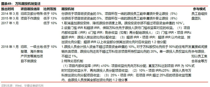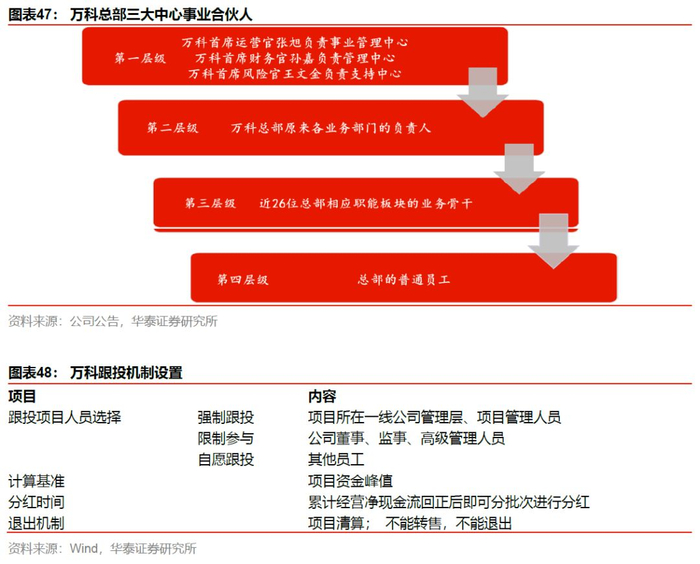 万科2010年公司推出经济利润奖金制度、2013年提出事业合伙人制度,面向管理层实行事业合伙人持股,2014年面向基层员工实施项目跟投制度,后续发布了“事业合伙人纲领”。激励机制跟随组织架构的变动持续演绎。2019年万科总部组织构架调整,成立事业发展中心、管理中心、支持中心三大中心,但事业合伙人机制依然运作,新成立的三大中心设置了四个层级的合伙人;项目跟投机制是短期激励机制,要求项目一线管理层参与,其他员工自愿跟投,比例不超过10%,累计经营净现金流回正后即可分批次进行分红。