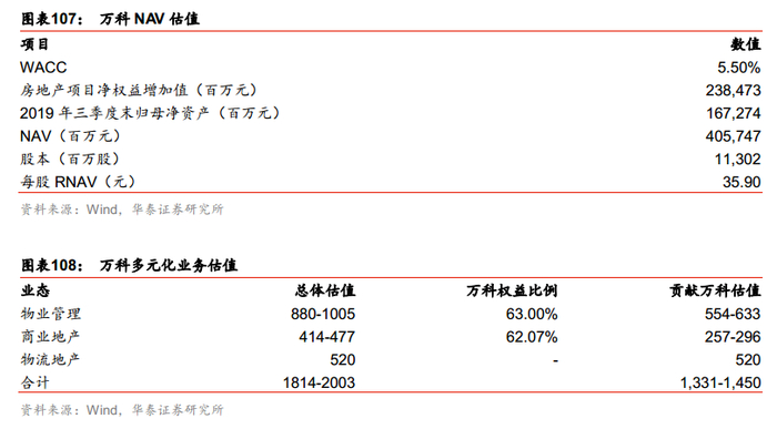 我们采用分部估值法对万科业务进行全面估值。其中地产开发主业采用NAV估值,多元化业务中,在市场上具备相对成熟估值体系的主要是三块业务:物业管理、商业地产以及物流地产,因此我们主要测算这三项业务。