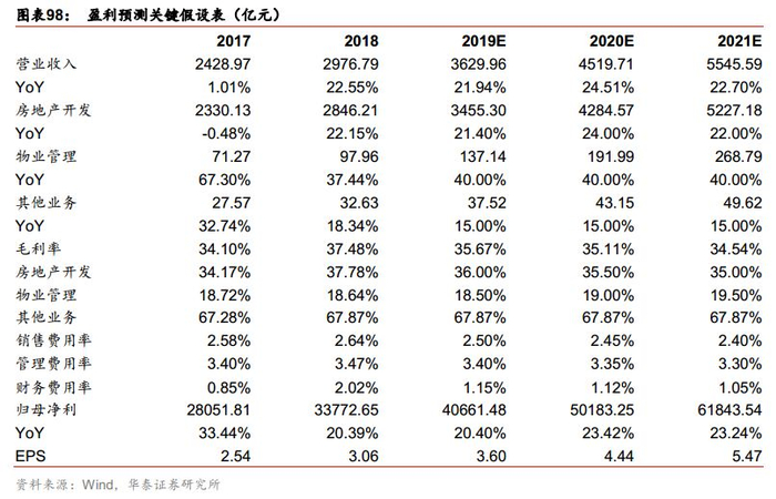 (3)其他业务:其他业务主要包括租赁住宅、商业开发与运营、物流仓储、标准办公、冰雪度假等偏持有型物业。鉴于目前公司主要持有物业都因采取基金模式出表,因此这部分总体收入占比不高且2017-2018年毛利率保持稳定(均值67.6%),保守假设2019-2021年营收增速维持10%,毛利率延续2018年的67.9%。