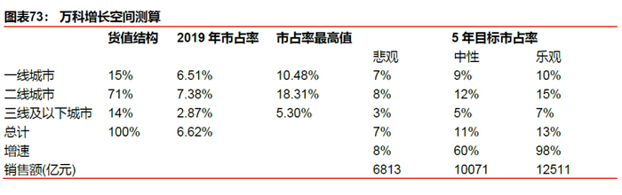 鉴于万科在一线、二线、三线及以下城市中,市占率的最高值分别可达10.48%、18.31%和5.30%,过去三年,万科市占率平均每年增长0.3个百分点,鉴于我们上述分析,未来提升的速度会进一步加快,中性假设下,我们认为公司在5年内一线、二线、三线及以下城市的平均市占率可由目前的6.5%、7.4%、2.9%分别增至9%、12%和5%,这意味着不考虑公司未来新增城市数量的拓展、所在城市销售规模维持平稳,仅仅依靠市场份额的提升,万科的销售额仍可达万亿以上,较当前销售规模仍有50%以上的增长空间,而如果考虑所在市场规模增长,则空间更大。