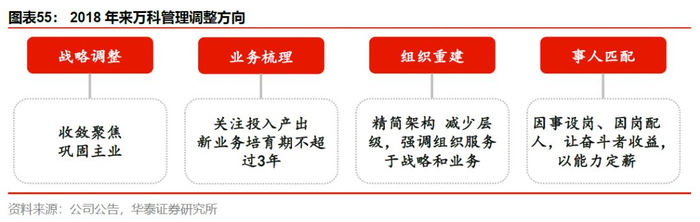 2018年公司提出内部调整,主要针对四大方面:1. 战略层面,提出收敛聚焦,巩固主业;2. 业务层面,提升对投入产出比的侧重力度,并强调培育3年后没有明确进展,或无法脱离万科内部资源的新业务将被剥离;3. 组织重建,精简架构,管理层扁平化,提升企业运营效率;4. 事人匹配。尤其提出让奋斗者受益,以能力定薪。