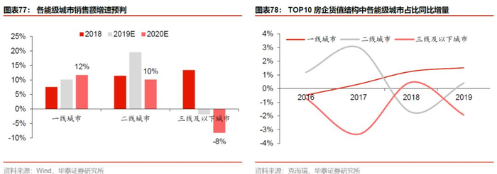 其次,成交结构的变化趋势也将利好于万科。2019年全国销售面积同比增速为-0.1%,我们跟踪的66个城市数据显示,一二线城市销售面积同比增速分别为11.5%和19.3%,意味着三线及以下城市的销售面积负增长,且逐月下行。从TOP10房企货值结构中一二线城市占比在19年普遍提升,同样印证——市场在向一二线城市倾斜,对于一二线城市最具市场优势的万科而言,无疑是一大助力。