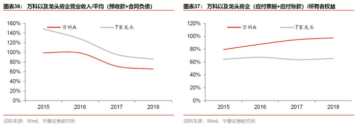 2、 应收杠杆。公司充分利用产业链上下游议价能力和供应链融资放大应收杠杆,2018年万科的应收杠杆(以“(应付票据+应付账款)/所有者权益”衡量)高达97%,高于龙头房企均值32个百分点。