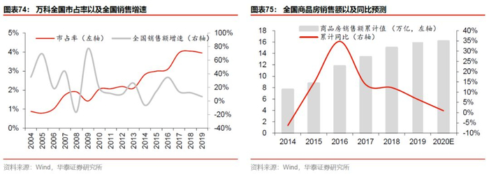 首先,2020年房地产行业销售大概率向下,核心原因在于房企融资收紧、三线及以下市场的刺激因素弱化以及疫情爆发下行业运行期缩短的影响,2019年全国销售额同比增速从18年的12.2%降至6.5%,我们曾在2019年11月25日发布的年度策略报告《平稳孕育分化,拥抱存量价值》中预测,2020年增速将降至0.9%。而万科在弱市中具备更强的市场渗透能力,从万科的历史走势来看,市占率在市场上行期往往处于温和守势,而市场下行期则大幅扩张,08、10、14年以及17年均呈现这一特性,我们预期2020年市占率显著提升可期。