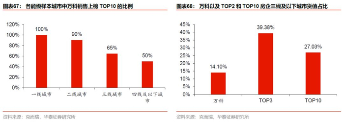 根据克而瑞数据,万科在一、二线城市的销售排名均值都为3.25名,而三线和四线(以及下)上榜城市排名均值为7.4和6.5名,城市销售额市占率角度,一二线城市的市占率分别是三线和四线(及以下城市)的2.2倍和3.2倍。从各能级城市万科上榜TOP10的情况来看,一、二、三和四线(及以下)城市中万科上榜的占比分别为100%、90%、65%和67%。即万科的优势领域在一二线。