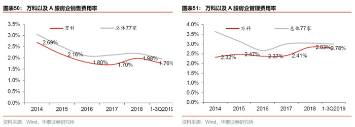 整体而言,万科的立体激励机制让企业与员工形成共同体,提升激励效能和决策效率。万科优异的管理能力在财报上的体现即管理费用率常年低于业内平均水平。以现金流口径,万科17年以来销售费用率为1.7%-2.0%,管理费用率为2.4%-2.8%,近年持续回落,2019年三季度末销售以及管理费用率依然低于行业平均水平0.2个百分点。