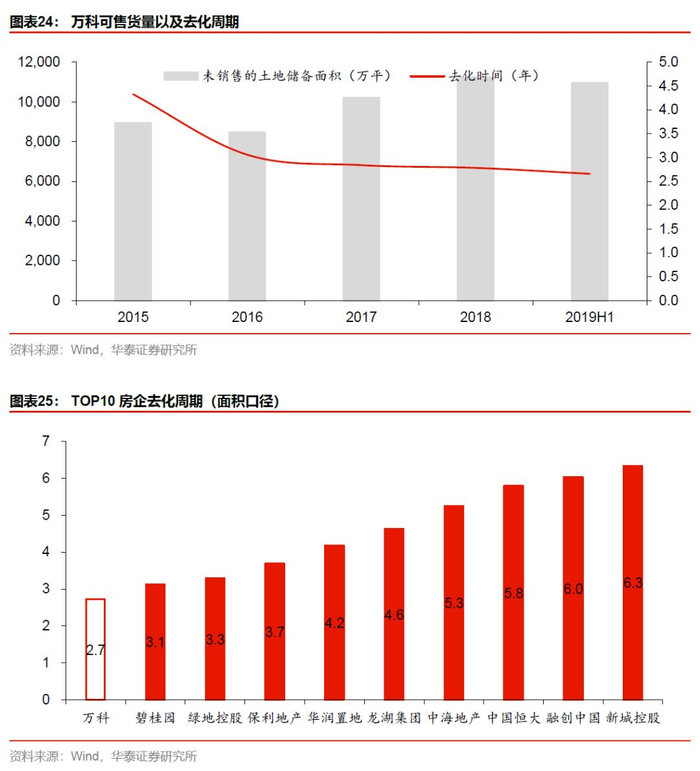 公司在2004年率先提出快周转模式,2008年确定了“不囤地、不捂盘、不当地王”的“三不”政策,并率先提出“5986”模式,即拿地5个月即动工、9个月销售、第一个月售出八成,六成产品必须是住宅。公司去化能力在业界有目共睹,快周转也成为现在业界公认的行业运营宝典。万科项目储备一直以满足未来两到三年的开工需要为尺度,万科认为这是现实的土地市场中,维持稳定经营和增长所能做到的最低,也是全球房地产龙头企业的最低水平。截止至2019年中期,以18年销售面积为去化口径,万科的去化周期为约2.7年,是头部房企中最少的。同口径测算下,主流房企的平均去化周期为4.5年,即万科较平均去化周期短1.9年。