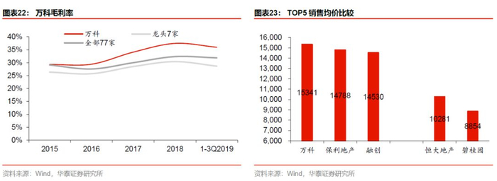 由此带来的终端溢价可在报表上得以体现,从销售均价上看,万科在头部房企中最具优势,2019年销售均价达15341元/平米,高于碧桂园、恒大,亦高于一二线占比同样很高的融创,我们认为核心在于万科在标准化制造、物业服务等加持之下具备品牌溢价。万科的毛利率水平一直较为突出,这在快周转企业里面愈加难能可贵。2019年前三季度,万科毛利率为36%,分别高出头部7家房企和全部77家房企均值7.3和4个百分点。