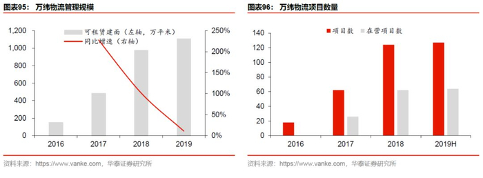 万科物流以“万纬物流”为物流仓储服务平台,据公司2019年中期业绩网上说明会上的汇报,经过近四年发展,截至2019年上半年,万纬物流服务客户超过800家,涵盖电商类、快递快运类、制造业类、餐饮类、零售商超类等各个领域。,运营64个项目(含55个高标库项目和9个冷链项目),其中高标库稳定运营项目平均出租率为92%。截至2019年底,物流仓储服务业务总建筑面积约1104万平方米,进入城市数达45个,总项目数达141个,全国化布局基本完成。