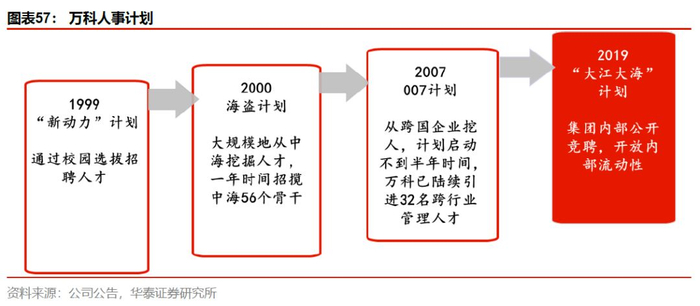 万科历史上曾开启“新动力”、“海盗”以及“007”三轮人事计划,为集团人才储备打下基础,也迅速提升了公司发展速度,如今万科已成为业内一大“黄埔军校”。19年公司再次提起人事计划,名曰“大江大海”,旨在强化内部流动性,提升业务管理层活力。19年5月,四大区域事业集团分别成立“大江大海工作委员会”,各区首为第一负责人,落实“大江大海”计划。对于业务高层空缺职务,内部正式启动自由竞聘。