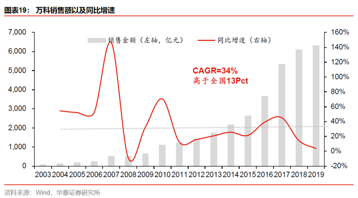 高质量布局叠加深耕能力,带来万科稳健的成长能力,回顾这十余年公司增速始终领衔行业。万科销售规模从2003年的59亿成长至2019年的6308亿元,年复合增速为34%,高于全国同期年复合增速13个百分点,2015年至今,年复合增速高达25%,高于全国同期水平9个百分点,仅2008年出现过负增长。