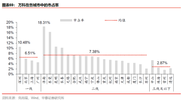 我们认为万科在三四线占比较低的核心原因在于万科对于下沉至低能级城市的审慎态度,而非去化能力。公司总货值结构中,三线及以下城市的占比仅为14%,分别低于TOP3和TOP10房企平均水平25和12个百分点。万科货值分布体现了这一特性:公司在低能级城市相对低的市占率是公司的主动选择。