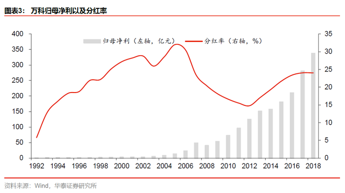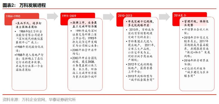 公司成立于1984年,1988年进入房地产行业,1991年成为深交所第二家上市公司。从万科第三个十年的开始,提出由专业化到精细化,实现有质量的增长,并走上了快周转的道路,2010年万科率先越过千亿门槛,并开始涉足商业地产。第四个十年,公司提出了房地产白银时代,并将定位从“三好住宅供应商”调整为“未来城市综合配套服务商”,从此物业管理、商业地产、物流地产、长租公寓、滑雪度假等新业务布局初现雏形。与此同时,公司也开启管理升级,开创事业合伙人机制。2018年,公司进一步将企业定位升级为“城乡建设与生活服务商”。万科是A股持续盈利年限、持续现金分红年限最长的公司,体现公司为计深远的运营态度,兑现注重股东回报的承诺。