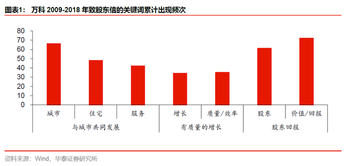 我们对过去10年万科的股东信做了量化统计,万科注重“与城市共同发展”,共提到“城市”66次;万科的基本盘在于住宅开发,但不仅仅在于住宅,共提到“住宅”48次,同时提到“服务”42次;万科不仅追求“增长”,注重增长的质和效,共提到“增长”34次,提到“质量”和“效率”35次;万科重视对股东的回报和价值,提到“股东”61次,提到“价值”和“回报”共72次。立足2020年,是在公司第4个“十年”过半的时候,来审视万科的前进步伐到了何处,对万科的研究,既是回望来路,亦是叩问前程。