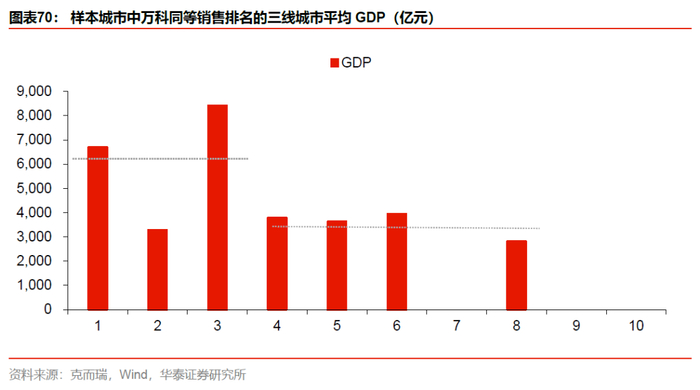 随着城市的发展,万科将更具市场认可度。而从对三线城市的具体排名来看,GDP越高的城市,万科在城市的销售排名越靠前。排名位于前三的城市平均GDP高出排名4-10位的城市水平72%。也正因如此,我们认为万科的增量空间在于所在城市的规模扩容和发展。城市经济持续向上,将愈发强化万科的市场优势和长线逻辑。根据我们整理出万科所在47个城市的数据来看,过去5年市场规模扩大了110%,即使考虑市场未来增速下降,但这些城市依然有保持稳健增长的底蕴。