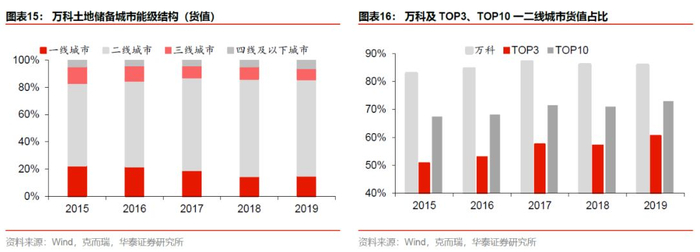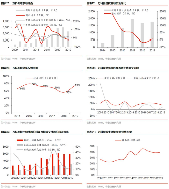 公司近年来土地战略的变化在于在权益上呈现逆周期。在土地市场持续升温的15-18年,万科的拿地权益从79%降至56%,而随着融资政策趋严,万科在2019年大幅提高了拿地权益,权益比重回升至75%,而且新增土储的楼面地价/当期销售均价在16-19年持续下降,19年这一比值为39%。充分说明公司拿地的理性态度,也在后续行业利润空间有所收窄的大环境下,为公司业绩稳定性打下基础。