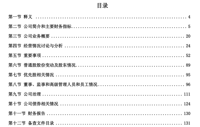 以年报为例,里面大概有些啥呢?大概目录会长成这样:除了第一节的一些名词解释之外,马上你会看到公司简介、公司这一年主要财务指标的表现,然后会介绍一下公司的业务,以及管理层对于这一年来经营情况的讨论,帮你迅速了解公司发展情况嘛。然后,还有一些公司重要的事情,以及董事、高管的信息,大家非常不愿意看的财务报表,其实出现的很晚,在第十一节左右,才是完整的财务报表披露。