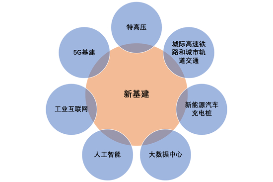2018 年 12 月中央经济工作会议首次提出“新型基础设施建设”的概念, 强调加快发展“5G  商用步伐、推动发展人工智能、工业互联网、物联网等”。“新基建”区别于传统“铁路、公路、机场”等传统基建项目,主要 包含“5G 基建、特高压、城际高速铁路和城市轨道交通、新能源汽车充电桩、大数据中心、人工智能、工业互联网”等方面。