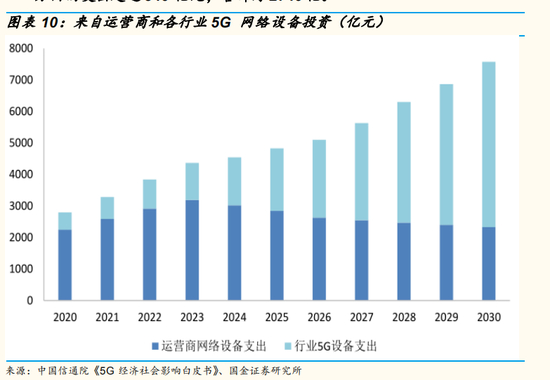 2020 年是 5G 商用初期,预计运营商开展 5G 网络大规模建设。预计电信运营商在 5G 网络设备上的投资超过 2200 亿元,各行业在 5G 设备方面的支出超过 540 亿元,合计为 2740 亿。