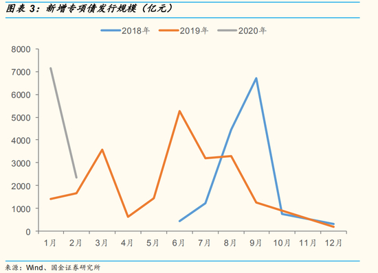 2020 年以来,地方政府新增专项债(不含置换专项债)发行规模 9498 亿,远超去年同期的 3078 亿的规模。按照财政部披露的数据,截至 2 月底,2020 年发行地方债券 12230 亿(含一般债 2732 亿),全部为新增债券,完成中央提前下达额度(18480 亿)的 66.2%。
