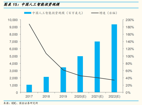  根据 IDC 对中国人工智能市场的预测,2020 年中国人工智能投资规模将达 50 亿美元(约 350 亿人民币),到 2022 年中国的人工智能市场投资规模将近百亿美元,将形成一个新的极具规模的的产业生态。