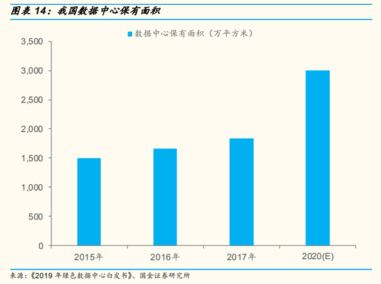3.5 数据中心:2020 年投资规模约 1000 亿  按照《2019 年绿色数据中心白皮书》,当前中国数据中心每年新增投资规模在 1000 亿左右,包含基础设施产品、服务器、网络存储、网络设备等。预计 2020 年中国规模以上的数据中心保有量将超过 8 万个,总面积将超过 3000 万平方米。