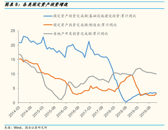 ¾ 为实现全面建设小康社会的发展目标,完成十八大提出的“2020 年实现国内生产总值比 2010 年翻一番”的目标,2020 年要实现 5.5%-6%左右的GDP 增速。这意味着固定资产投资要维持在 5%以上的增速,假设制造业和房地产投资增速维持去年相对水平,根据各类投资占固定资产投资的比 重,按照基建投资 25%左右的占比,预计 2020 年基建投资投资增速达 10% 左右(2019 年增速为 3.3%),基建投资规模达 15 万亿左右。
