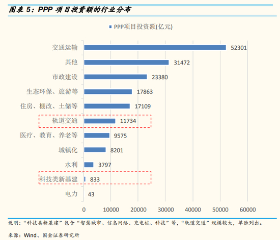 我们从 PPP 项目的行业分布来看,总体来看“新基建”相关项目占比为 7%。具体而言,“交通运输、市政建设”等行业投资规模相对较大,分别为 5.2 万亿、2.3 万亿。而“新基建”相关的轨道交通和科技行业合计规模 1.3 万亿,总体占比达 7%。其中轨道交通为 1.2 万亿,科技类新基建为 833 亿。
