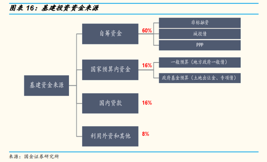 基建投资资金来源可以分为四大类:1)自筹资金(以非标融资、城投债和PPP 等为代表),占比达 60%左右;2)国家预算内资金(包括地方政府债和土地出让金等方式),占比达 16%左右;3)国内贷款(银行贷款等),占比达 16%;4)利用外资和其他资金来源,占比为 8%。