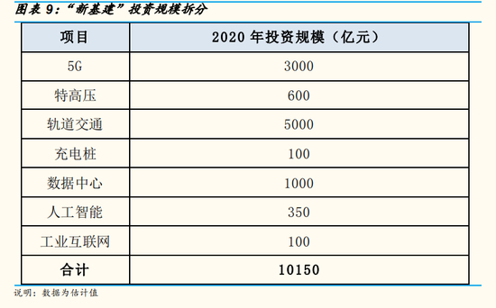 从专项债资金运用和 PPP  项目分布分析我们看出,“新基建”占全部基建的比重大概在 7%-12%,保守估计,我们预计 2020 年新基建规模超 1 万亿,其中 5G 投资规模近 3000 亿、特高压投资规模超 600 亿、轨道交通投资规模在 5000 亿左右、充电桩投资规模约 100 亿、数据中心投资规模