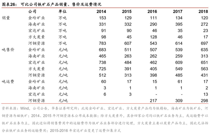 除公司外,涉及铁矿石业务的A股上市公司有金岭矿业、海南矿业、宏达矿业和方大炭素。横向对比看,2018年宏达矿业铁矿石均价最高,海南矿业最低,或主要因品位、产品状态差异,如海南矿业直接销售铁矿石,而其余四家公司产品为加工后的铁精粉或磁铁矿。